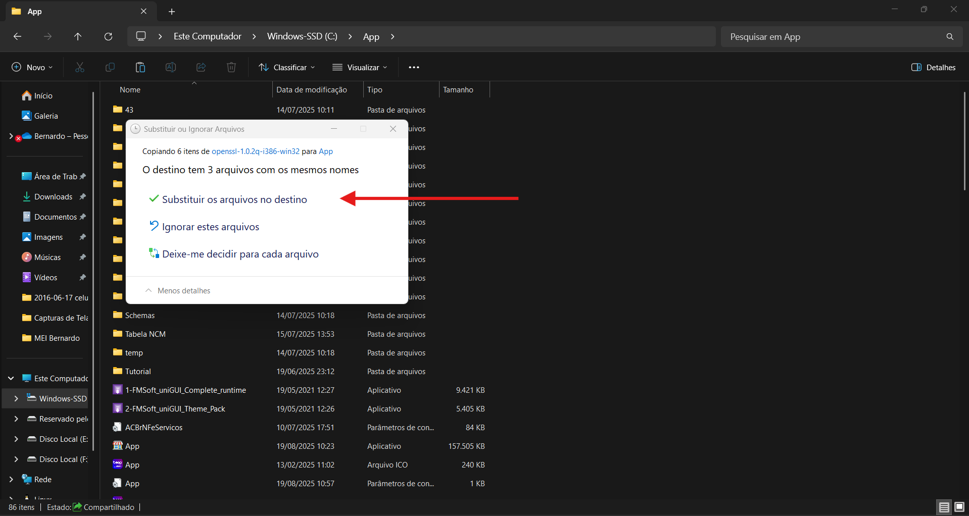 Quando o Windows perguntar se deseja substituir os arquivos, escolha “Substituir os arquivos no destino” (ou “Sim para todos”).