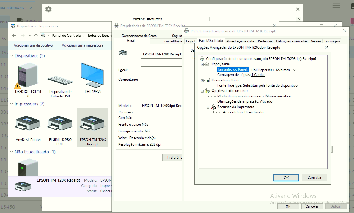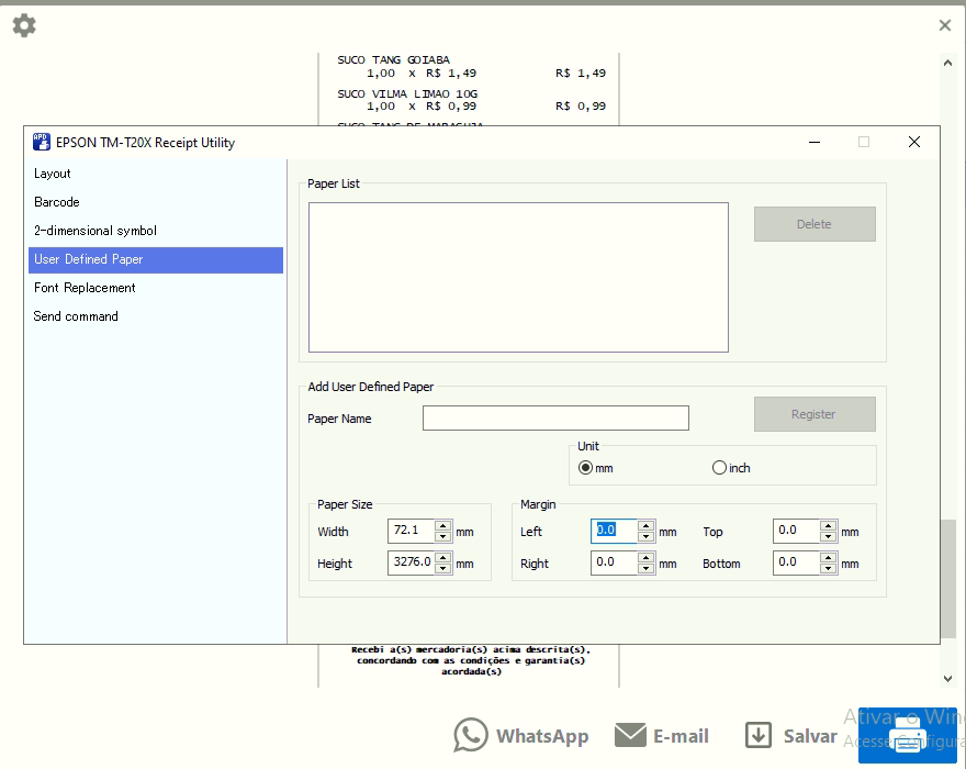 Ao imprimir um cupom que excede o tamanho máximo de 20cm, é necessário ajustar as prefêrencias de impressão e escolher o tamanho máximo do papel para 80mmx3276mm