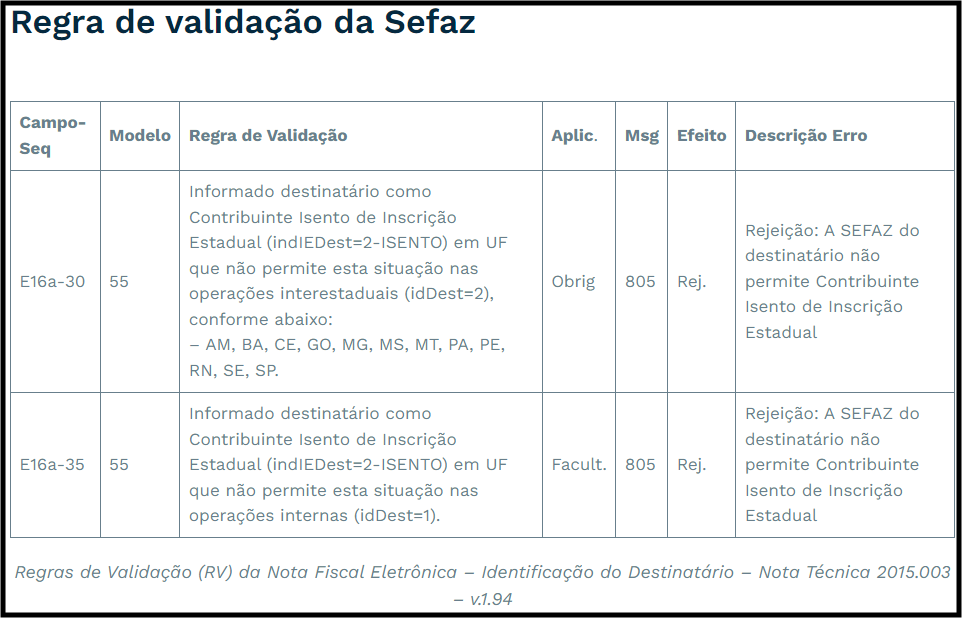 Rejeição 805: A SEFAZ do destinatário não permite Contribuinte Isento de Inscrição Estadual