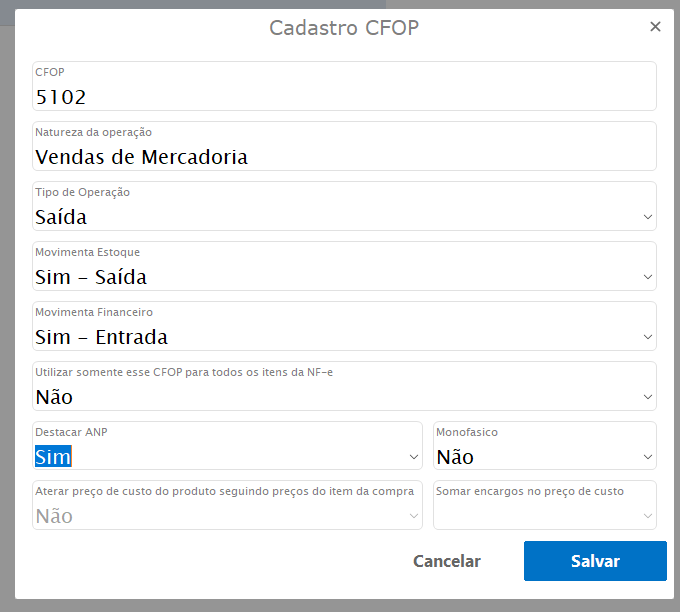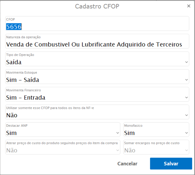 Também é importante configurar o CFOP específico para este tipo de item, veja com a sua contabilidade o mais adequado, na hora de configurar o CFOP é necessário destacar o ANP.