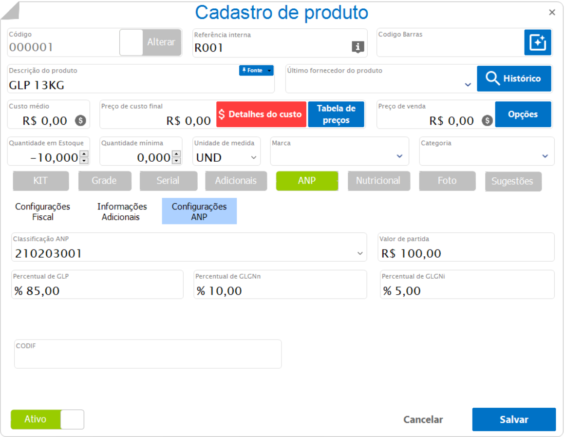 Cadastro de produto do tipo GAS, Combustível
