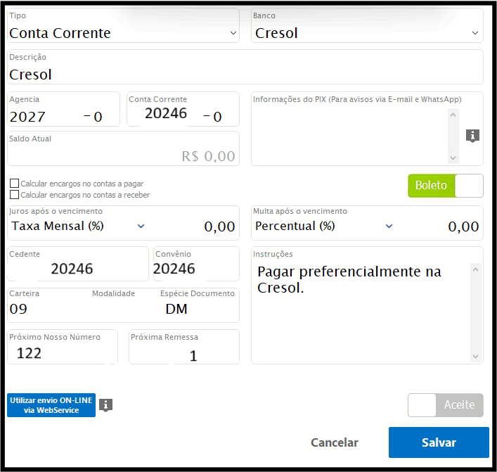 Mensagem local de pagamento: Pagar preferencialmente na Cresol.
