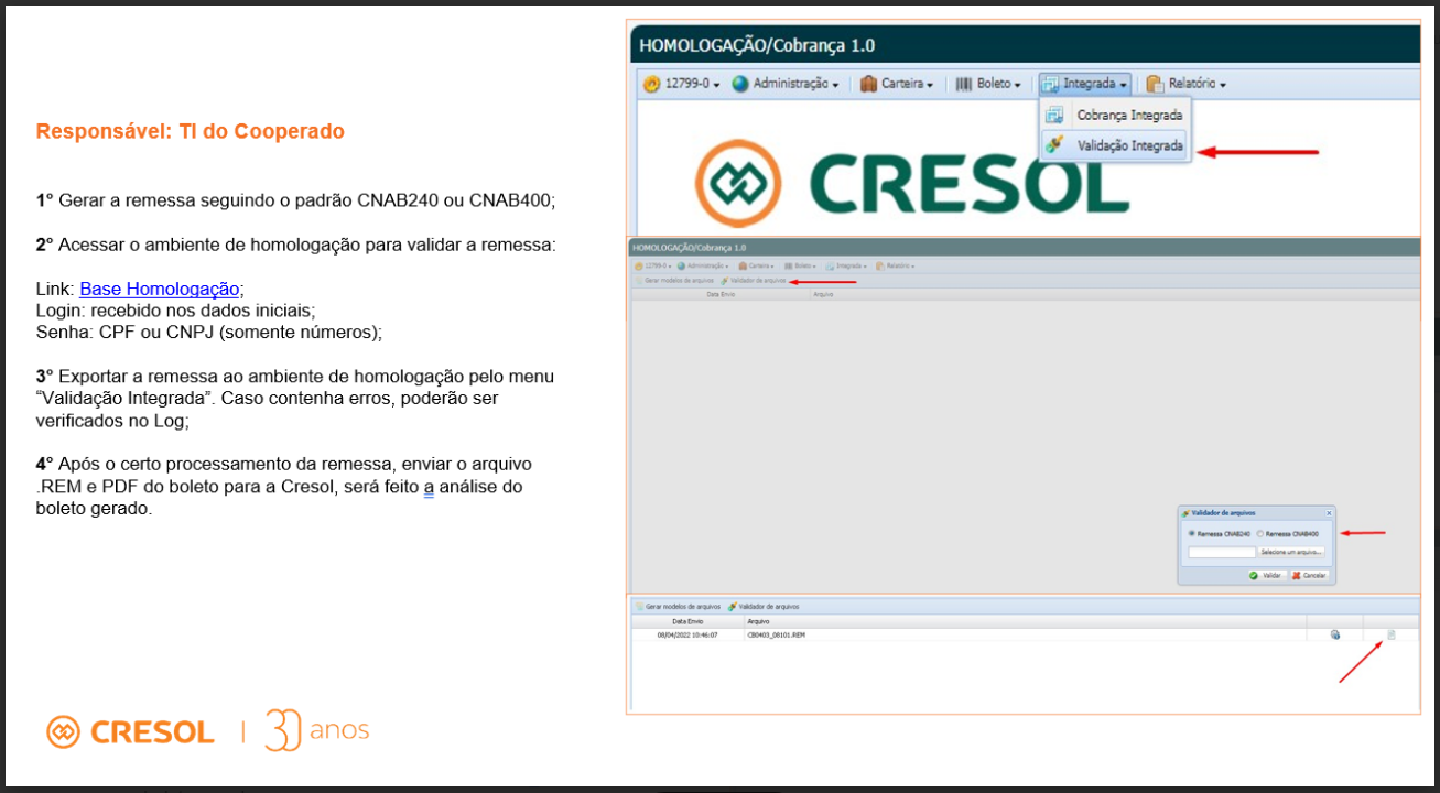 Lembre de salvar o primeiro boleto pdf (gerado pelo sistema) e a remessa e depois enviar no e-mail para o banco finalizar a homologação