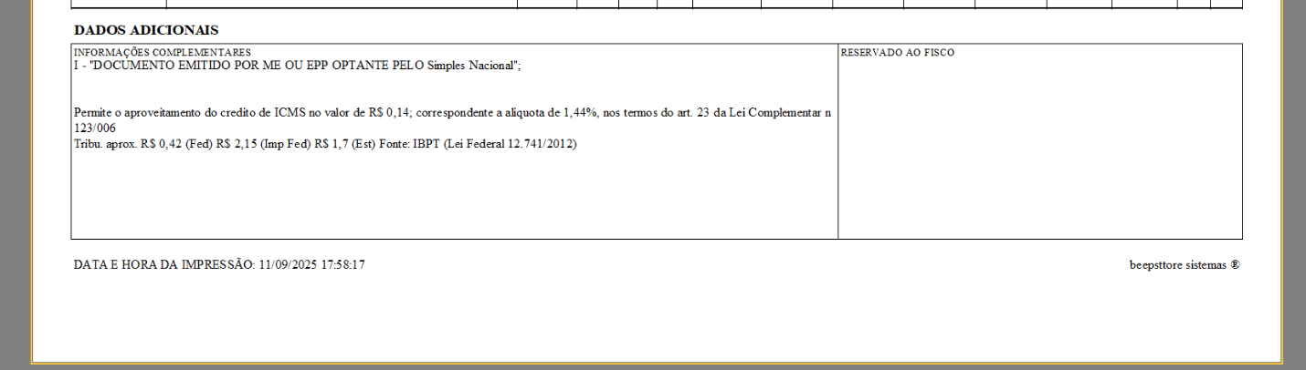 Após transmitir a nota fiscal, nos dados adicionais irá aparecer a informação sobre o aproveitamento do ICMS.