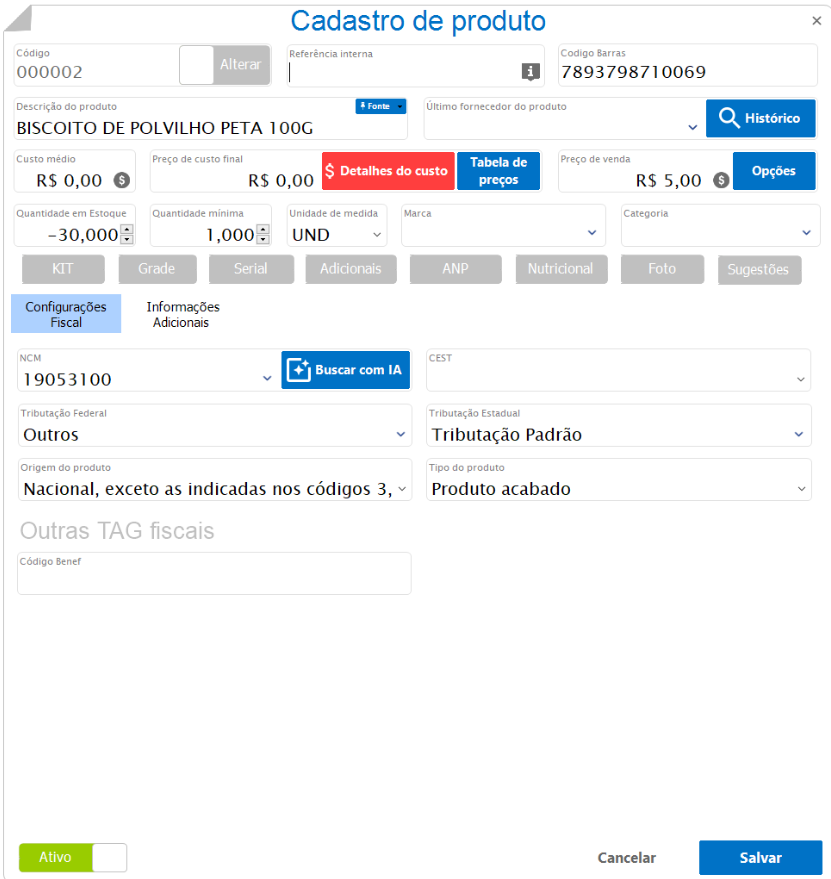 Neste exemplo, o item é produzido, então foi preciso ajustar o tipo do produto para "4 - Produto acabado"