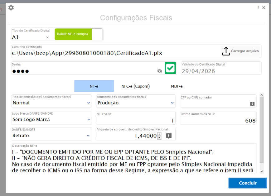 Nas configurações fiscais do emitente, informe a porcentagem do aproveitamento de ICMS de acordo com instruções da sua contabilidade.