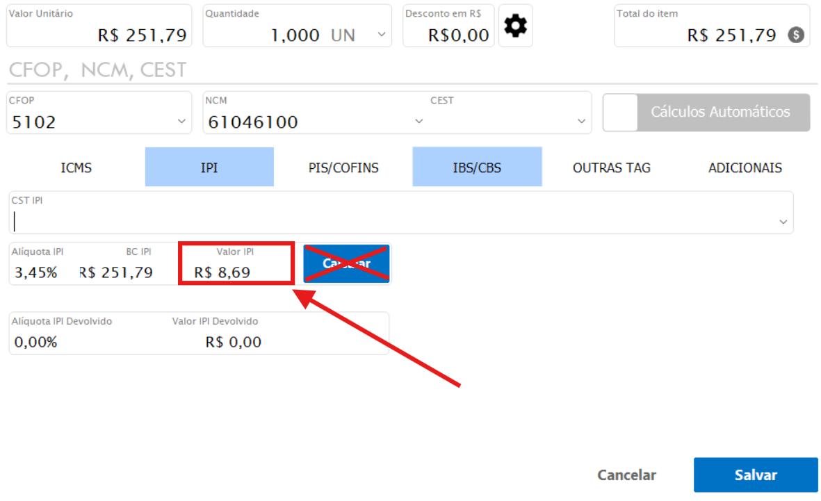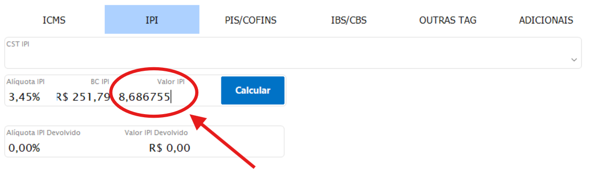 Porém quando clica em cima do valor do IPI o valor correto que está na nota é mostrado. (Isso acontece pois foi clicado em calcular) 👇