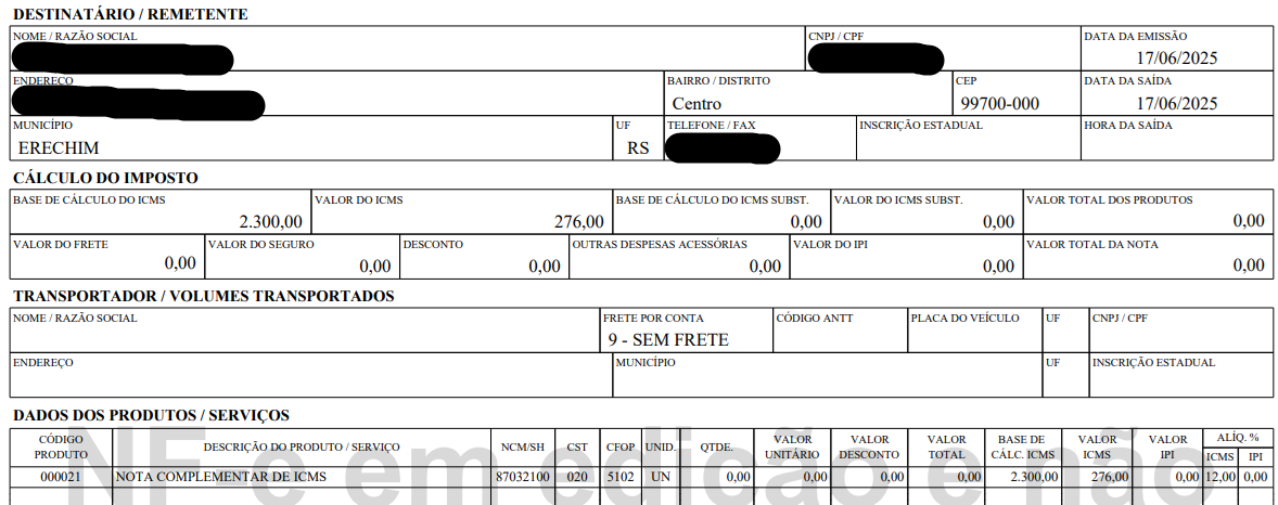 Uma nota complementar de ICMS ocorre quando a NF foi transmitida e por algum motivo foi usado outro CFOP, ou CST, e com isso não calculou o valor de ICMS, veja um exemplo.