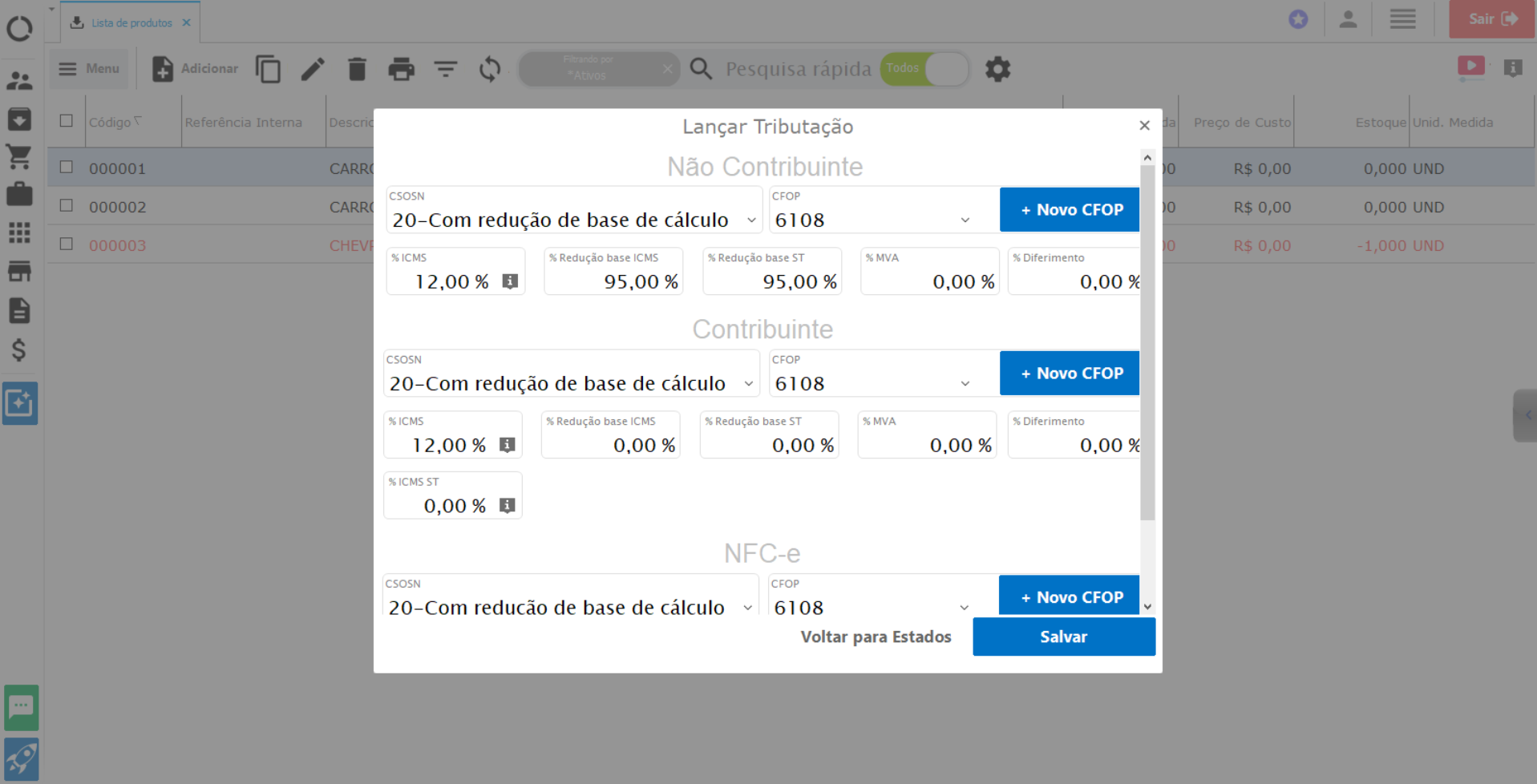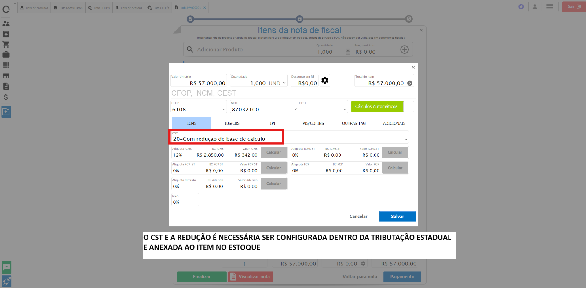 •CST ICMS: 20 (Com redução de base de cálculo para veículos usados).