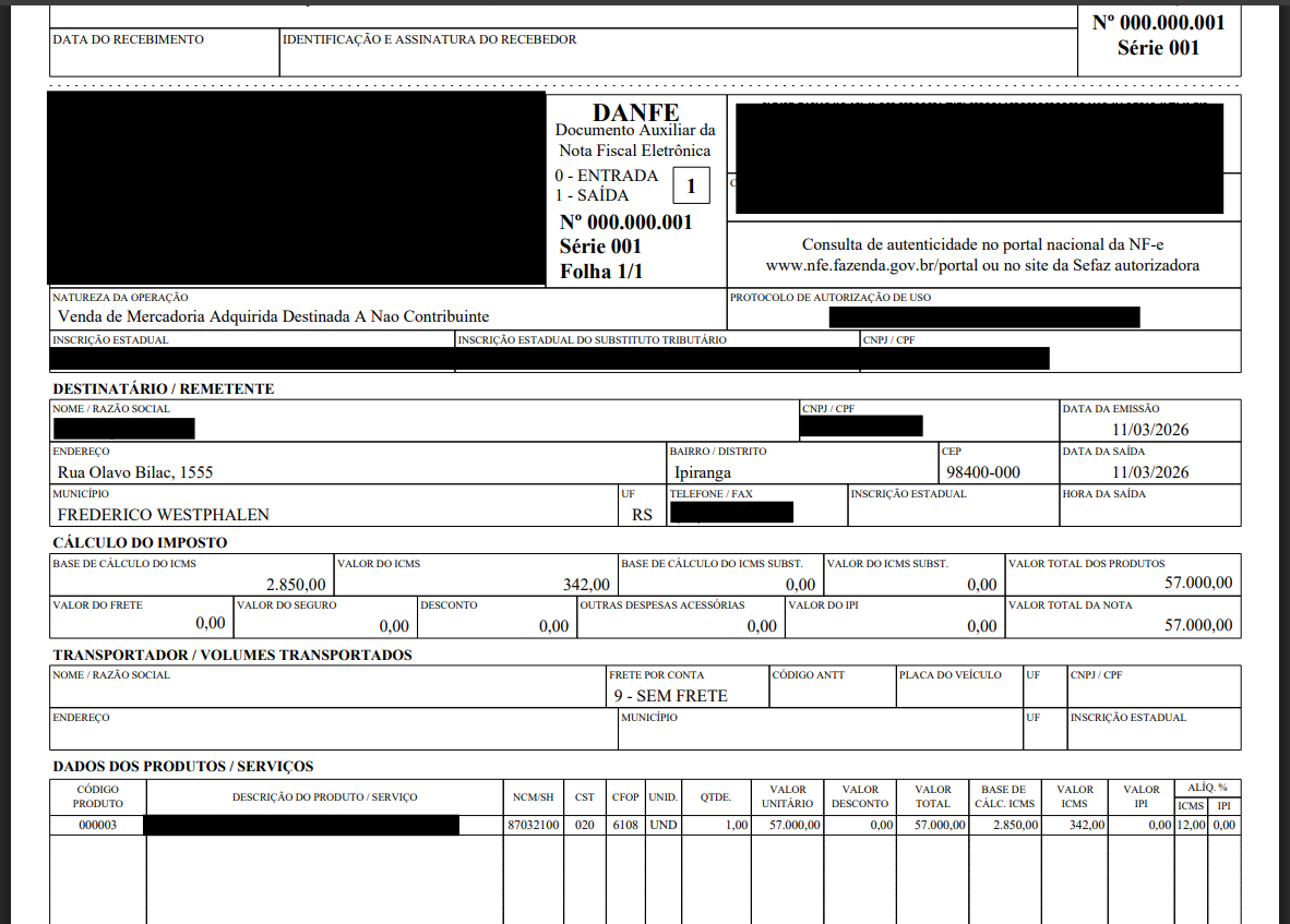•CFOP: 6108 (Venda de mercadoria para não contribuinte em outro estado).