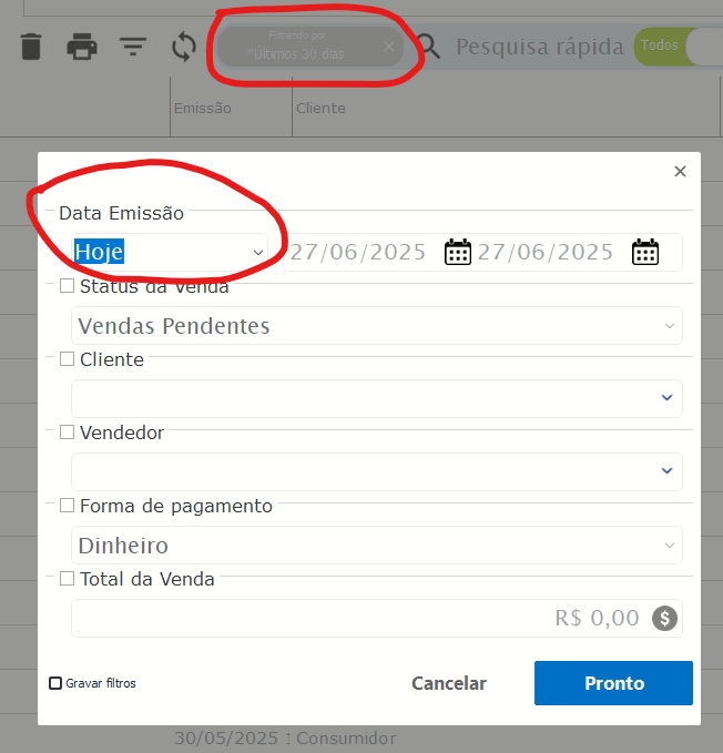 Utilize os filtros disponíveis (por data, garçom, status da venda, entre outros) para refinar a busca de acordo com a sua necessidade. -