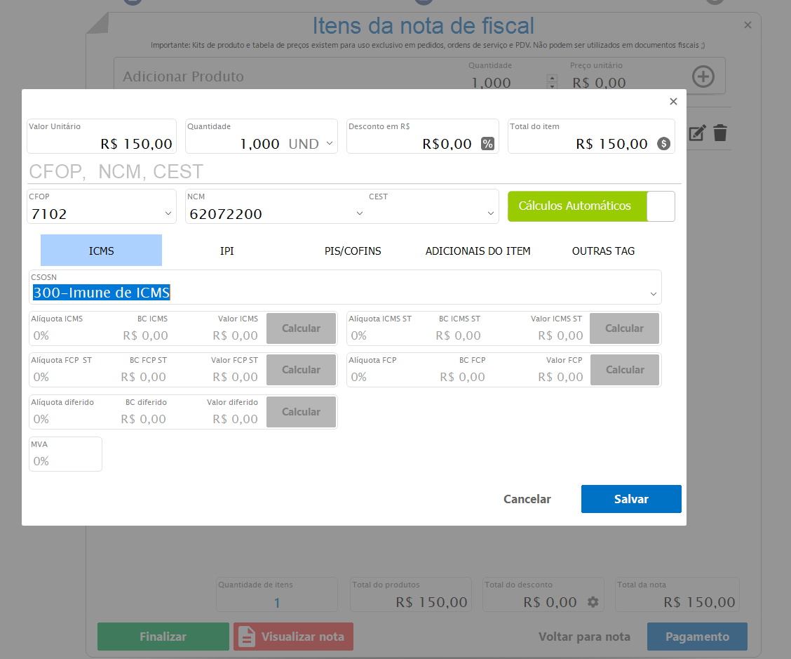 Confira se os produtos inseridos estão com CFOP e CSOSN corretamente configurados.