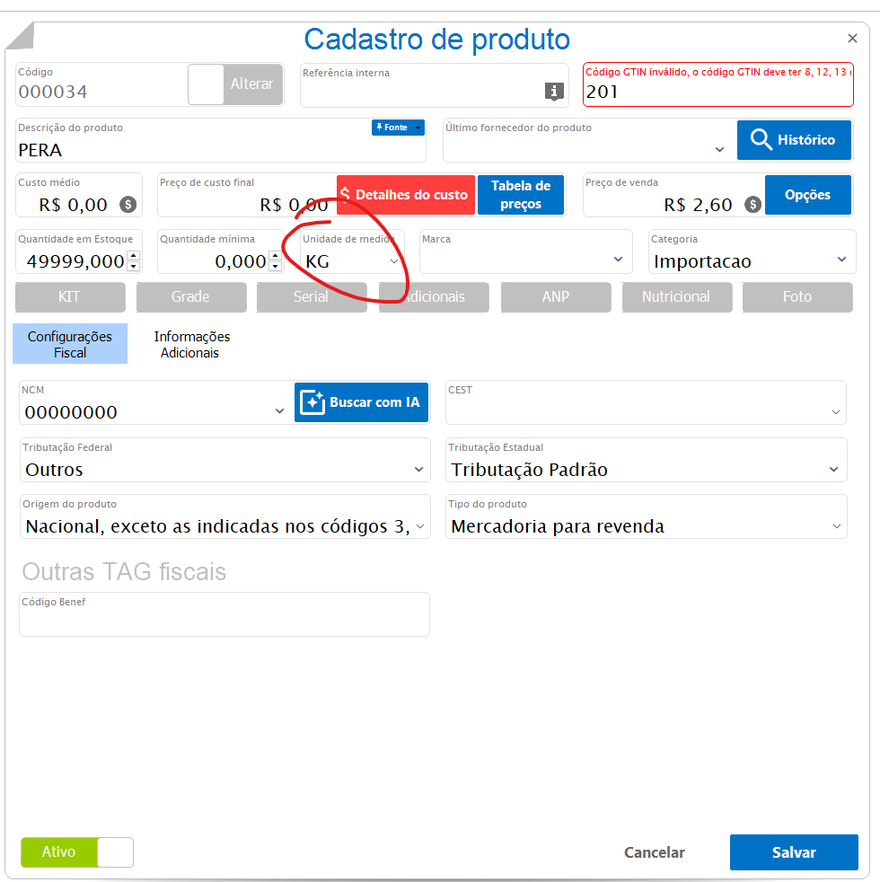 Para fazer uma venda de produto por peso, primeiro é preciso ajustar o cadastro do item para informar a unidade de medida em KG.