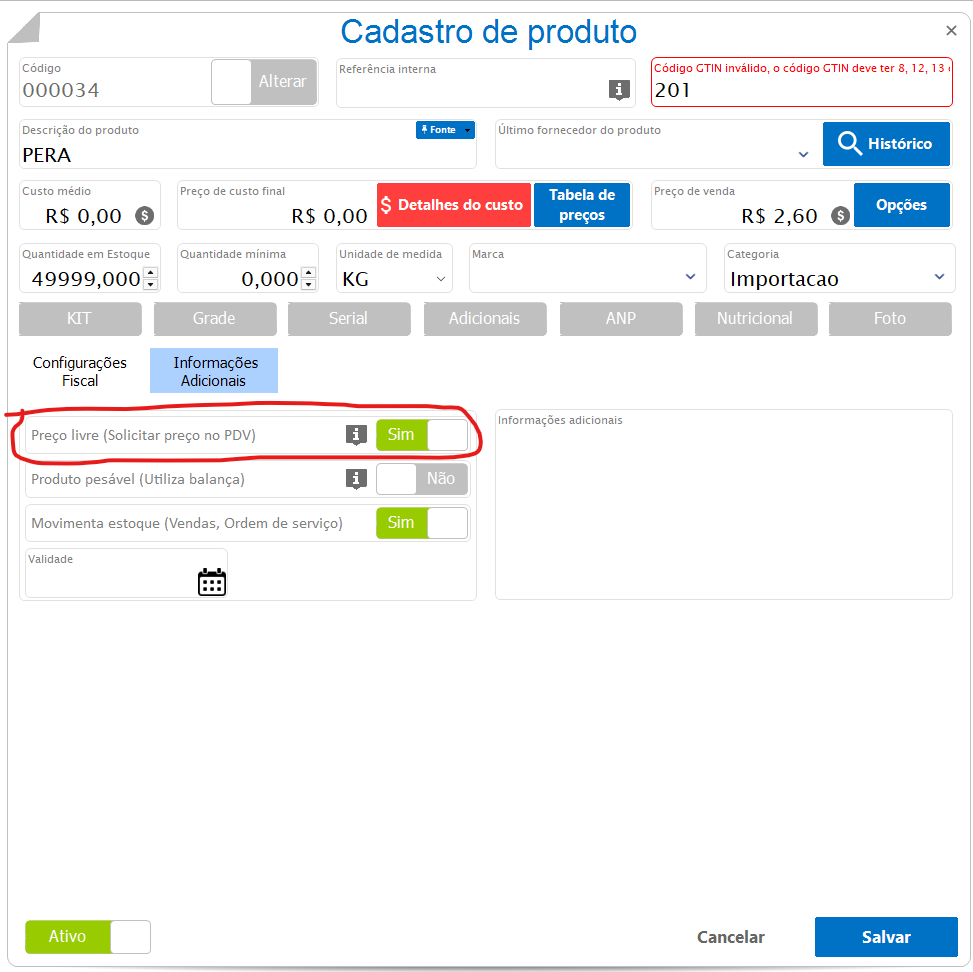 Acesse a aba "Informações Adicionais" e habilite a opção "Preço Livre", esta opção é quem liberará a tela de pesagem no momento da venda no PDV.