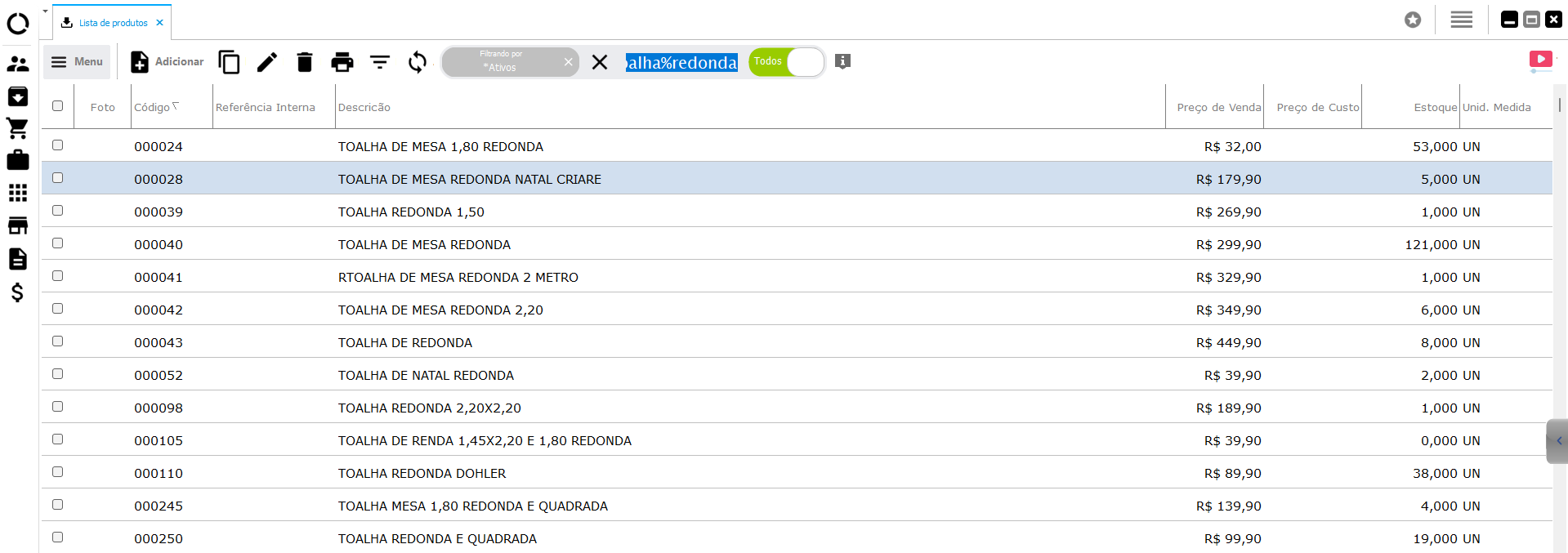 Neste exemplo o sistema irá buscar todos os itens que tiverem o nome "TOALHA" e "REDONDA" na sua descrição, veja o exemplo.