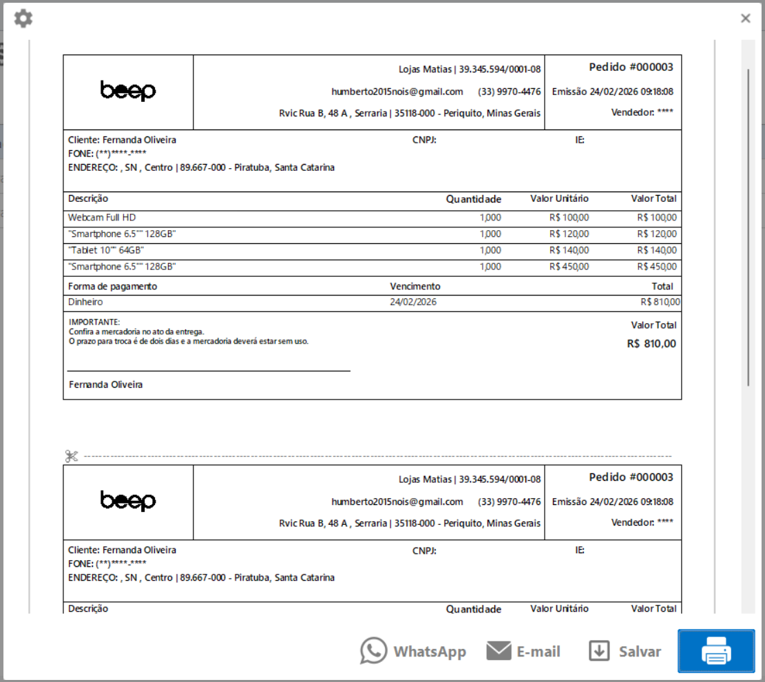 Ficha de Pedido Duplo - 2 vias em uma página somente