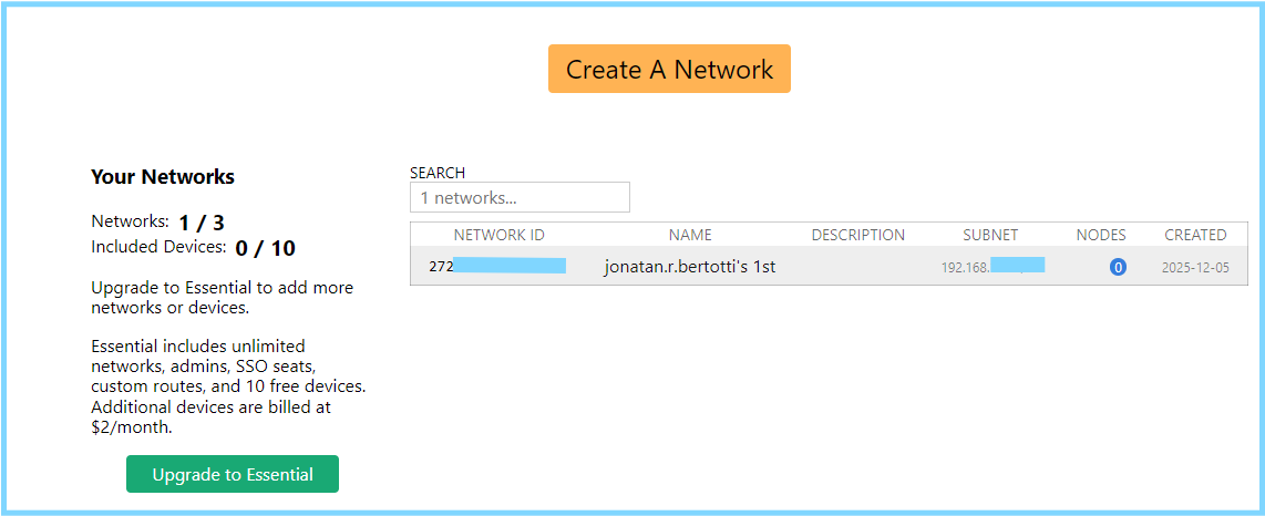 Após clicar em "Create A Network", ele irá gerar uma Network nessa listagem.