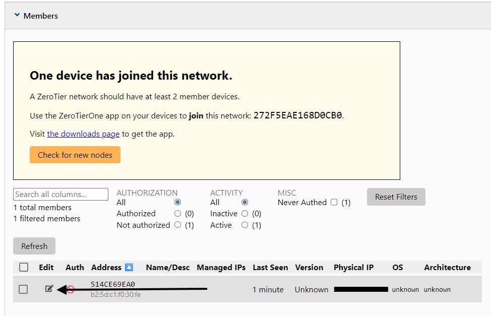Após isso, volte no site do Zerotier, entre na Network criada, vá na aba de Members pois os computadores que foram colocados os IDs irão aparecer na listagem.