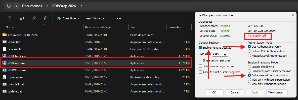 Atenção, se ficar como [not supported] vai precisar fazer a troca das infos do app.ini do RDP que fica em C:\Program Files\RDP Wrapper (o arquivo .ini e outros arquivos estão na outra página chamada "Arquivos")